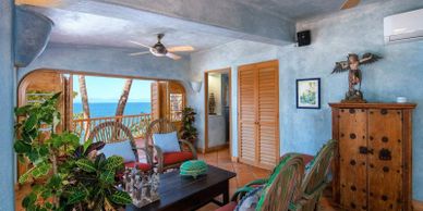 Also known as the mermaid suite for the extensive collection of mermaid art work, this suite is the closest to the beach and the most private and secluded option. Decorated in shades of blue, the Seaside suite hosts a king size bed, lounge area, and balcony with ocean views. Fall asleep to the sounds of the ocean.
